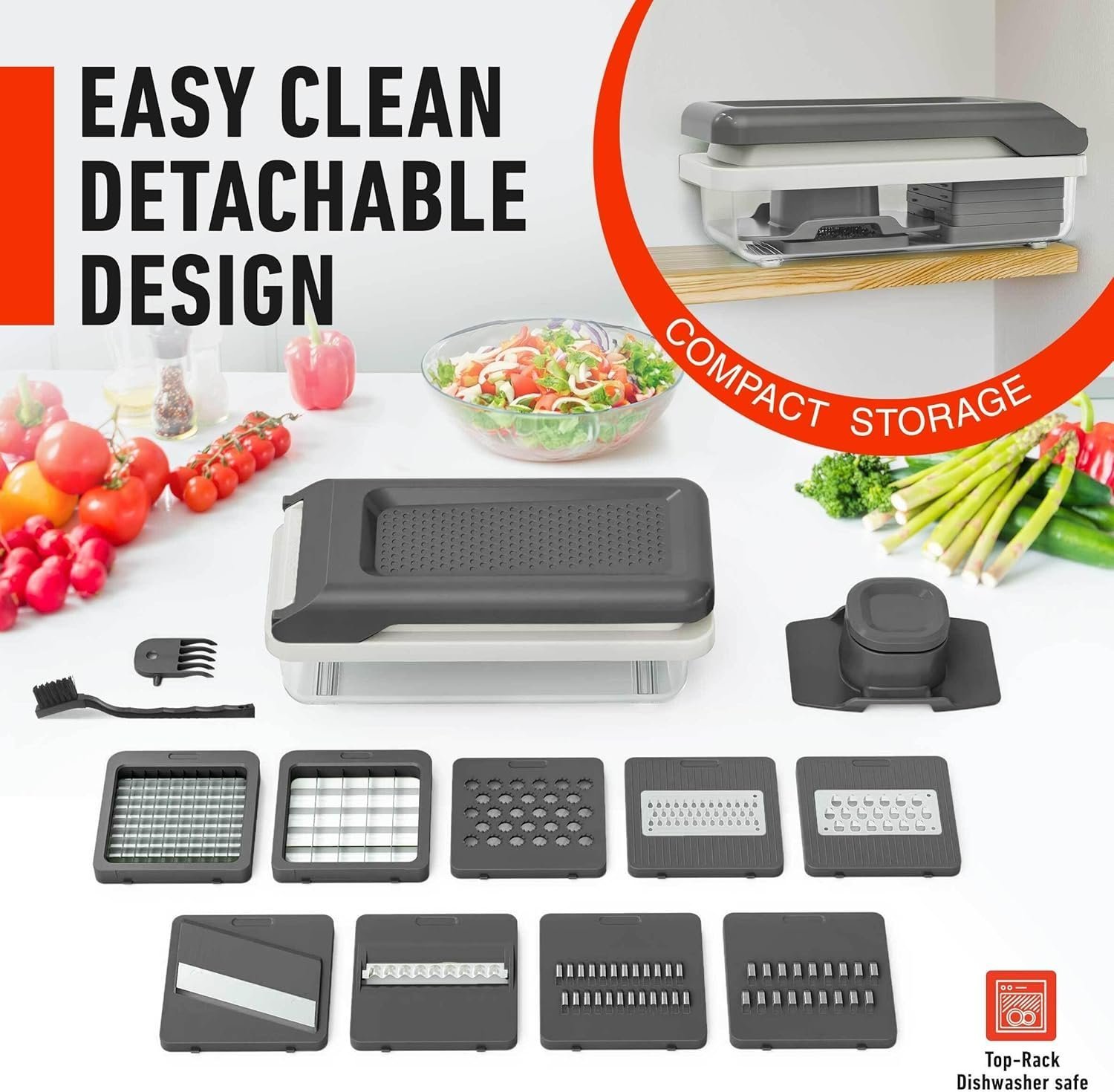 • Unmatched Quality – Free-up countertop space with the Food Container. Use the Food Holder while cutting small vegetables and fruits. This prevents food from slipping while slicing it. It also makes it clean, safe, and easy to work with. No more hassles of washing and wiping. Dismantle it and just put it in dishwasher. Cleans easily in minutes with the complementary scrubbing fork. Its compact size allows you to store it almost anywhere.