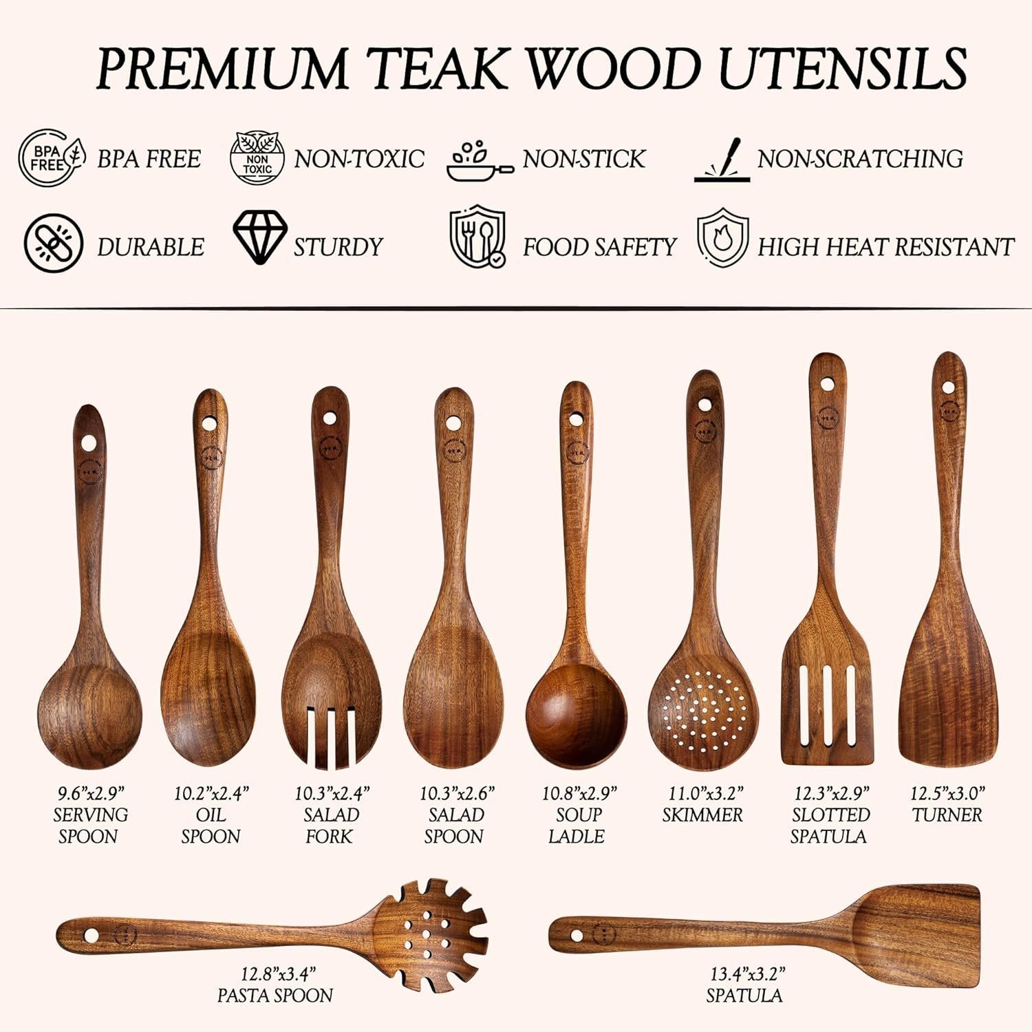 - DURABLE AND SMOOTH: Made from high-grade teak wood, these utensils offer exceptional durability and a smooth, comfortable grip, making them ideal for everyday use